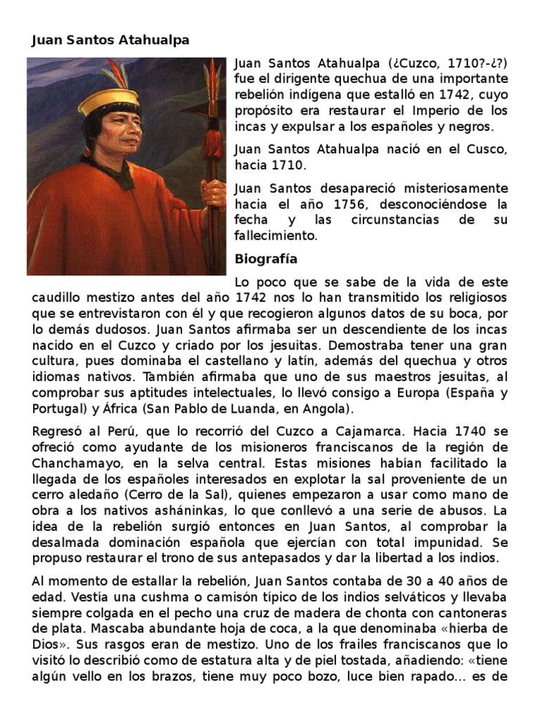 Juan Santos Atahualpa. Santos Atahualpa, Juan. Cuzco (Perú), c. 1710 - Perú, c. 1756. Líder mesiánico de la rebelión indígena anticolonial del Gran Pajonal, Selva Central del Perú. Los datos biográficos de este personaje nunca se han podido precisar documentalmente, pues tanto su vida anterior a 1742 como su muerte están rodeadas de.