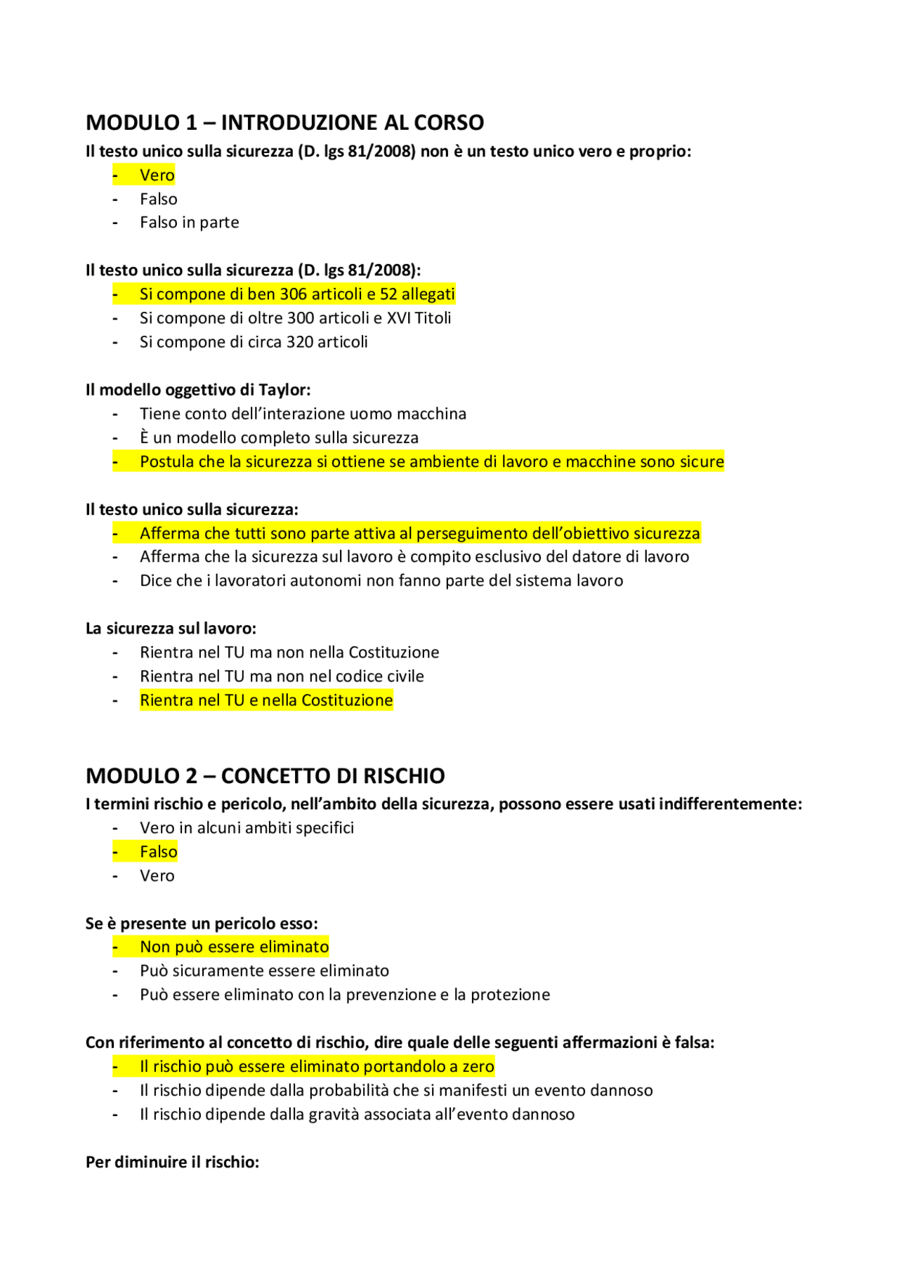 Risposte corrette ai test di Sicurezza sul lavoro (ecampus) Prove d'esame di Impianti